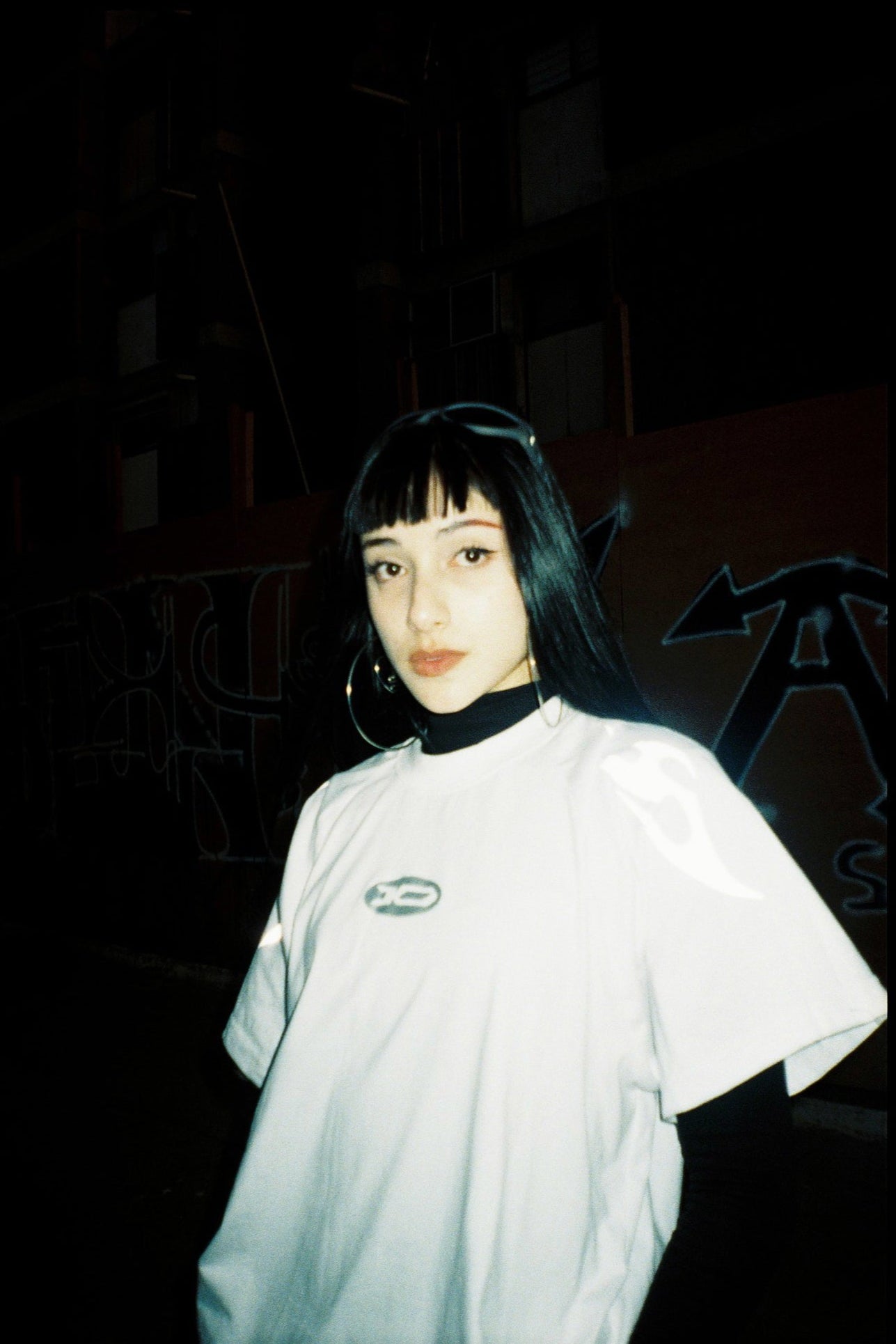Corte oversize. Polera blanca con logo redondeado K.O. Su diseño refleja velocidad y el fuego en tu centro.El vinilo reflectante brilla con luz directa, como lo hace un guerrero cuando la calle o el combate lo exigen.