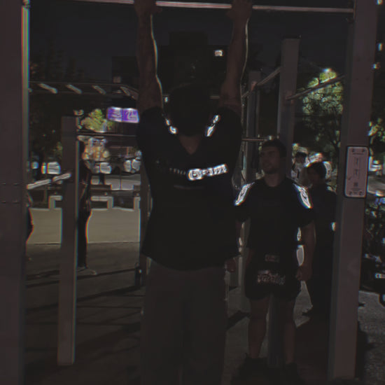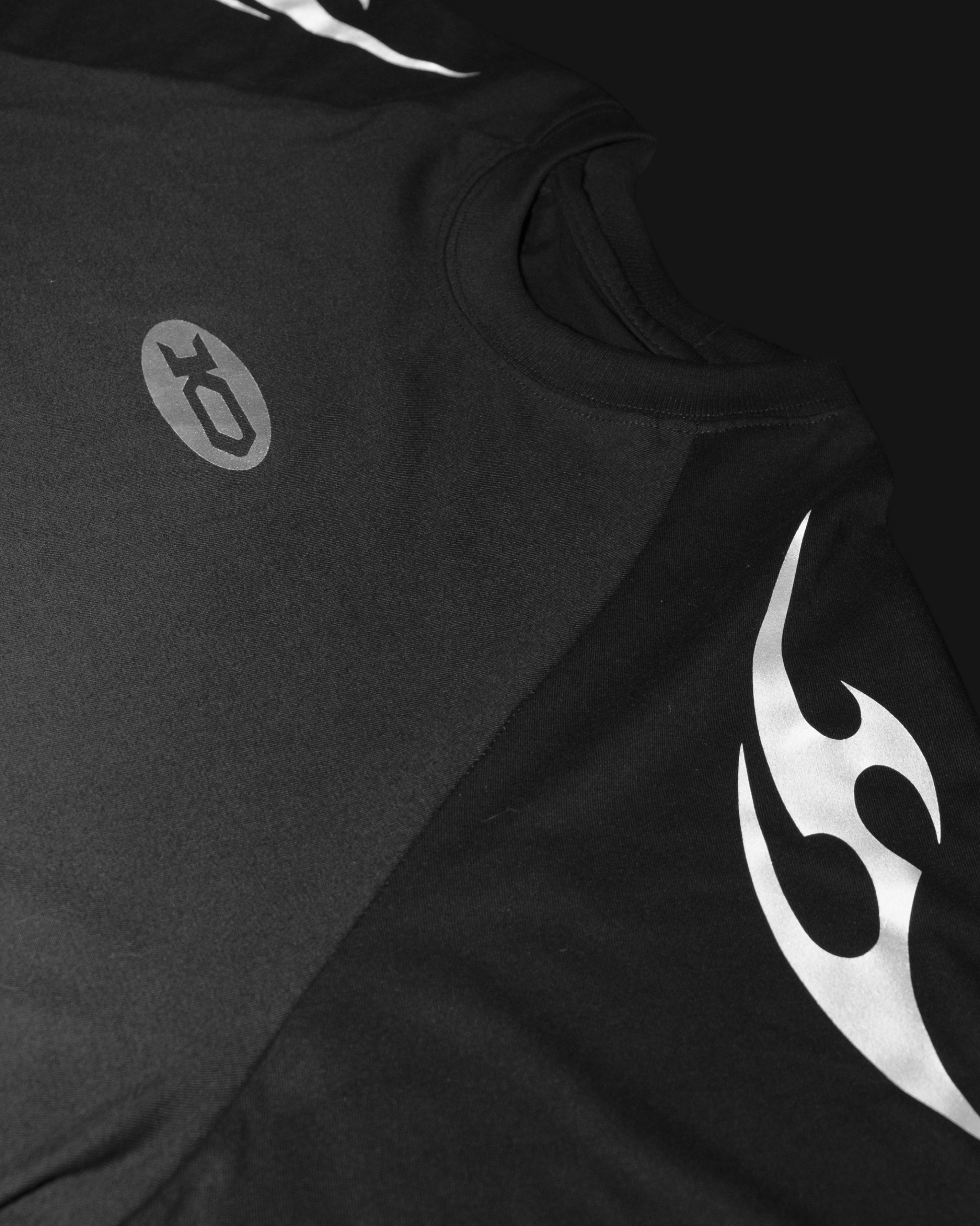 Corte oversize. Polera negra con logo redondeado K.O. Su diseño refleja velocidad y el fuego en tu centro.El vinilo reflectante brilla con luz directa, como lo hace un guerrero cuando la calle o el combate lo exigen.